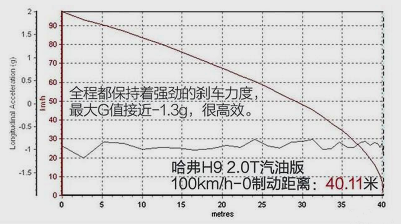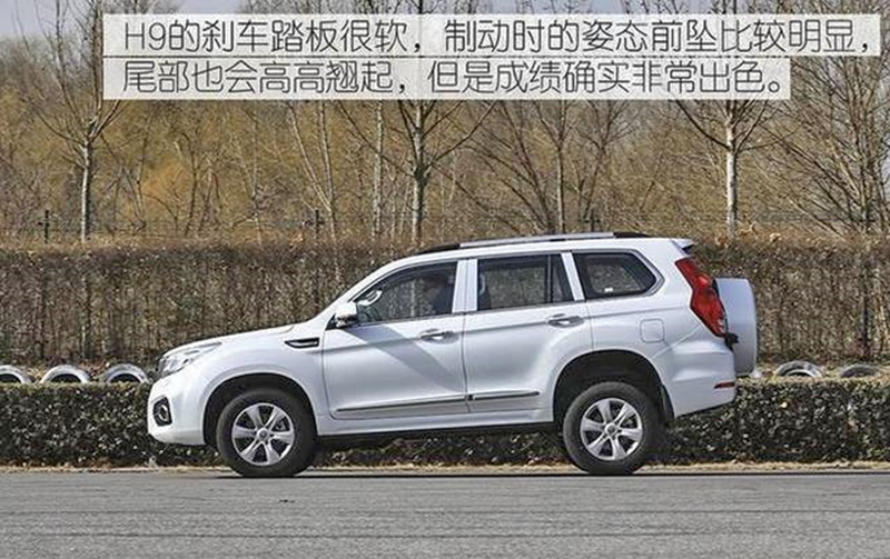 剎車測試與加速一樣,H9也給我們奉上了一份很滿意的答卷。超過2.3噸的車重在制動時肯定會帶來更大的慣性,再加上較軟的懸掛阻尼以及較長的行程,所以H9的車頭在制動時前傾明顯,前懸掛被極度壓縮,尾部翹起的幅度也很大。雖然姿態(tài)如此,但是憑借足夠強力的制動和265mm輪胎的超寬接觸面積,H9還是做出了40.11米的優(yōu)異成績,在同級中屬于出色水平了。