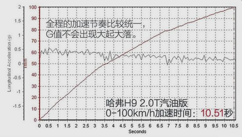 先把動態(tài)模式調到運動,然后關閉ESP車身穩(wěn)定系統(tǒng),發(fā)動機轉速可以打到2500轉左右,迅速抬起剎車,H9從靜止到起步的狀態(tài)轉換很快,沒有那種慢吞吞的遲鈍感,并且四驅系統(tǒng)還保證了動力傳遞的均衡,所以H9的整個加速過程很直接也很穩(wěn)定,10.51秒的加速成績對于這么一款僅搭載了2.0T排量發(fā)動機的中大型SUV來說已經非常不錯了。