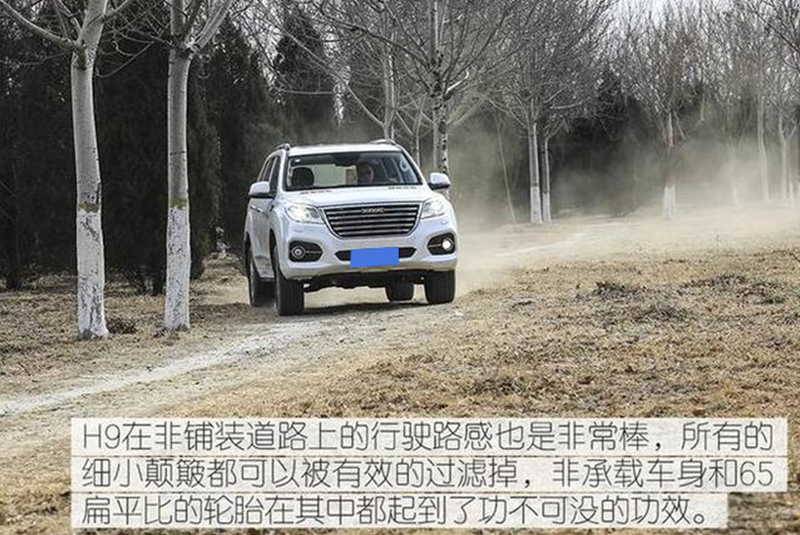 我們都知道戶外道路上的碎石會非常多,而且坑洼也會比鋪裝道路上要大很多,但是H9在這種道路上行進會把原本很生硬的震動弱化,沖擊感自然也就不會再那么直接和強烈,頻繁到惹人厭煩的顛簸也會被懸掛有效吸收,減少車身上下連動的頻率,這種極度舒適的車感絕對是一般SUV所不能比擬的。