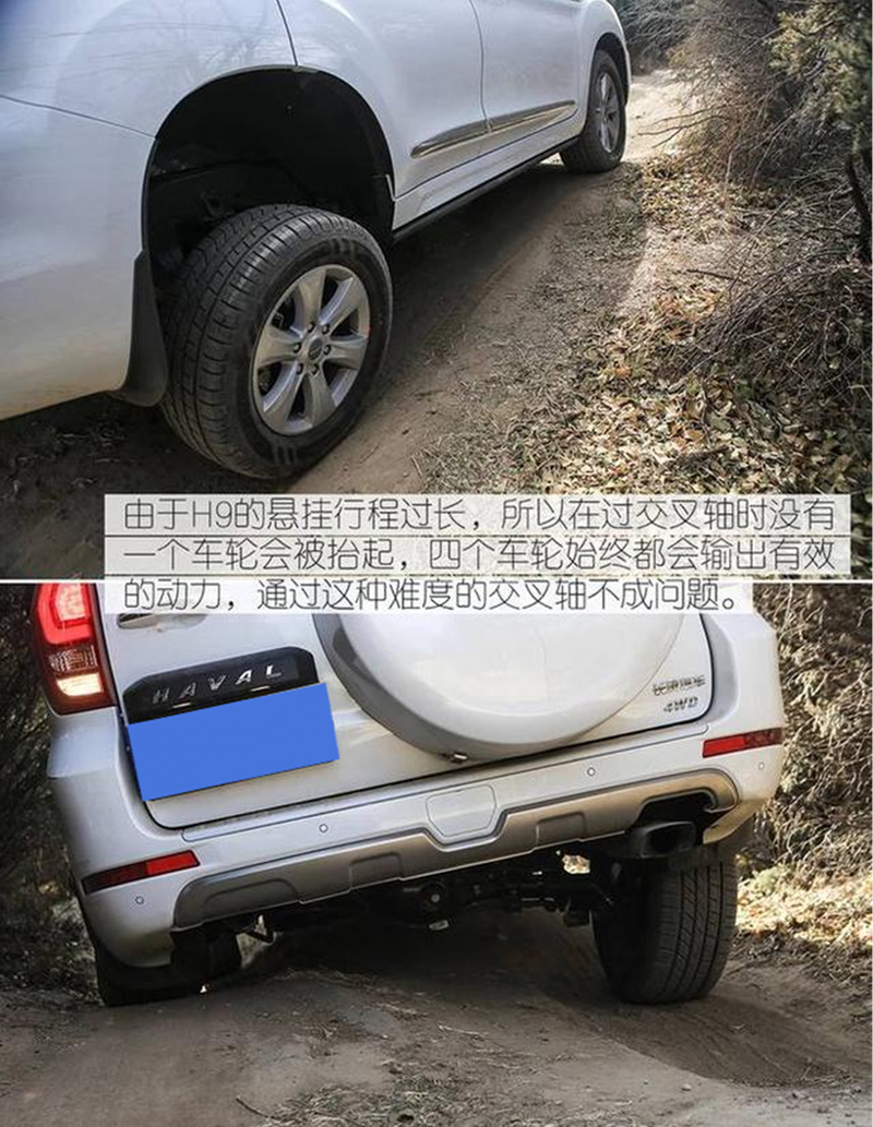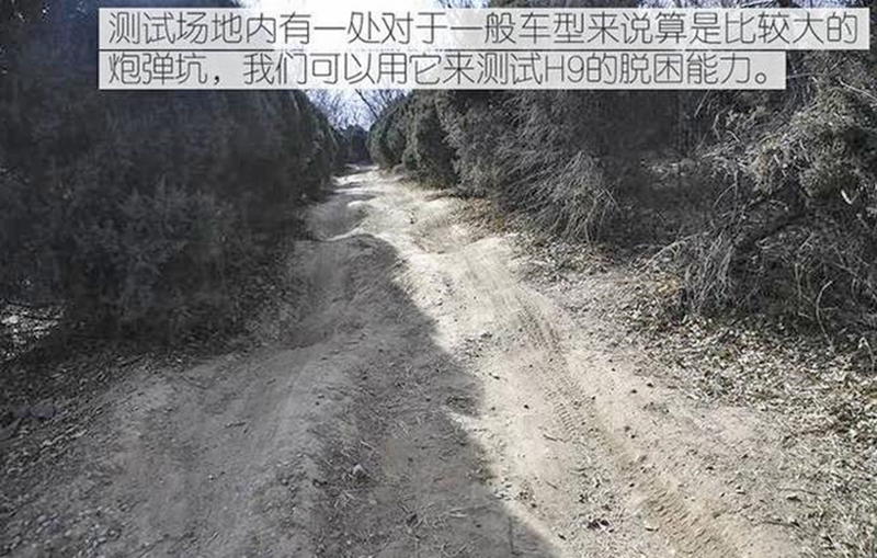 交叉軸已經成為考量越野車能力強弱的一個必備項目,所以在場地內我也找到了一處炮彈坑來考驗H9的脫困能力,不過很遺憾并“沒有成功”。為什么這么說呢,這并不是說H9深陷坑中百般猙獰,相反它通過得非常順利,而我說的不成功是指沒有達到車輪被架起的最難效果,因為H9懸掛的行程太長了。