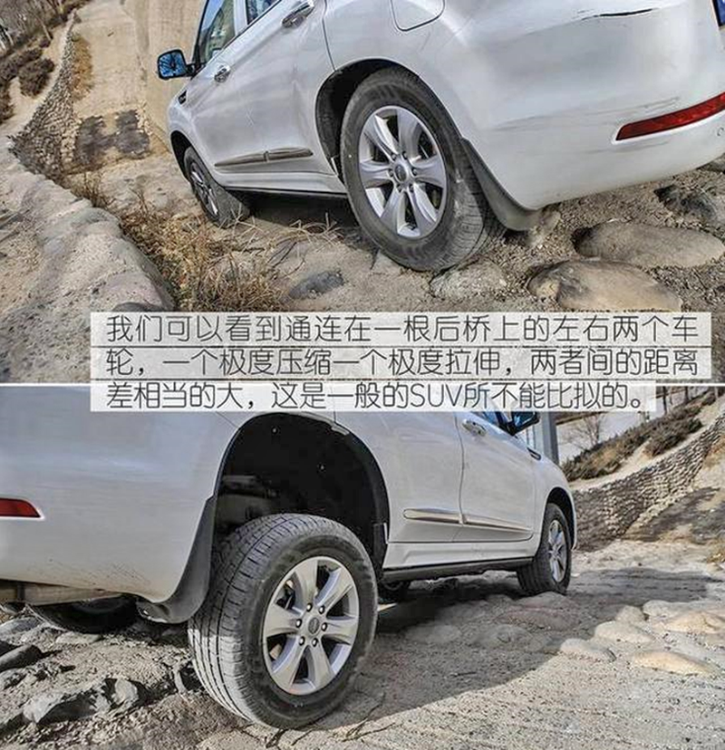 從圖中就可以看出來懸掛最長與最短之間的行程差有多長,不管再怎么嘗試,車輪始終都會與地面接觸持有摩擦力,不會出現(xiàn)任何的空轉來影響動力的無效消耗,所以要想難住它的話只能另找更艱難的路況來考驗,此場地內對于H9來說構不成難度。
