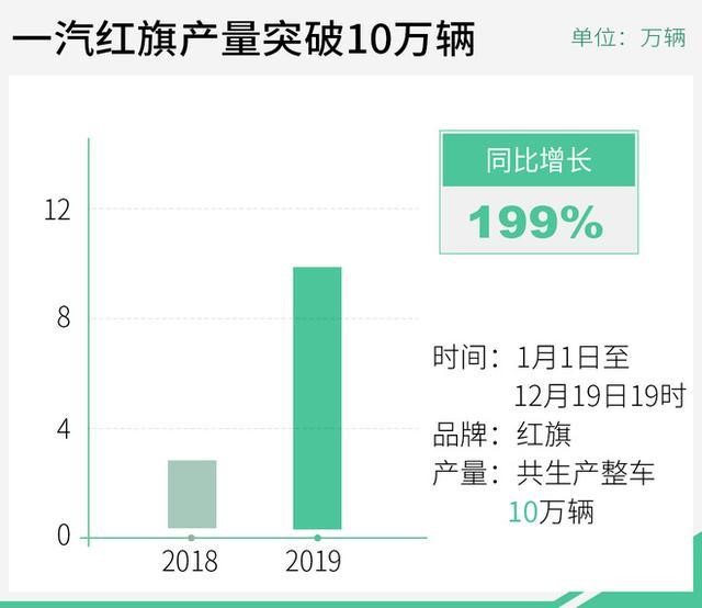 而從一汽紅旗官方獲悉,截至12月19日19時(shí),一汽紅旗銷(xiāo)量已突破了10萬(wàn)輛,產(chǎn)量相比去年同期增長(zhǎng)了199%。此前,一汽集團(tuán)董事長(zhǎng)徐留平曾表示,預(yù)計(jì)2019年一汽紅旗全年銷(xiāo)量為11萬(wàn)輛,那么完成新的全年銷(xiāo)量目標(biāo)想必也是指日可待了。