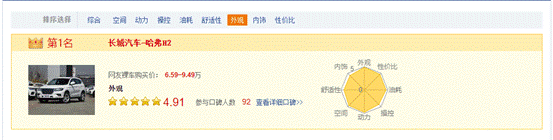 而在汽車之家網(wǎng)站中,哈弗H2更憑借外觀、動力、油耗等多方面的領(lǐng)先優(yōu)勢,位列小型SUV市場口碑第一。其中空間、動力、性價比等方面,哈弗H2得分全部超過4.7分(滿分5分),外觀得分更是達(dá)到4.91分,強(qiáng)勢領(lǐng)跑同級市場,成為當(dāng)之無愧的“狀元座駕”。