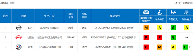 從最終成績來看,比亞迪宋MAX在耐撞性與維修經(jīng)濟性、車內(nèi)乘員、車外行人分別獲得了P(較差)、P(較差)和G(優(yōu)秀),別克GL8則為P(較差)、M(一般)、A(良好)、G(優(yōu)秀)。