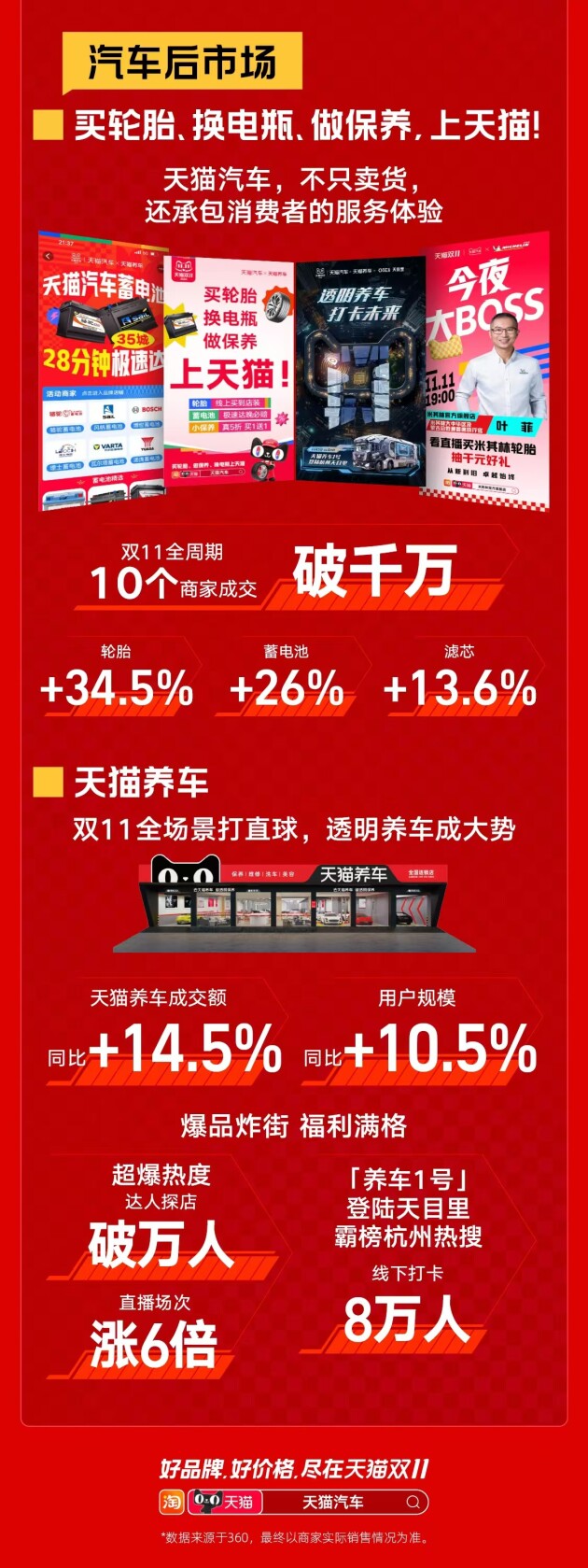 天貓汽車不只賣貨,還承包消費者服務體驗:新零售模式背景下,輪胎「線上買線下裝」銷售增長34.5%,蓄電池銷售增長26%,天貓養(yǎng)車爆款保養(yǎng)增長110% —— 消費者用行動選擇: “買輪胎、換電瓶、做保養(yǎng)上天貓” !