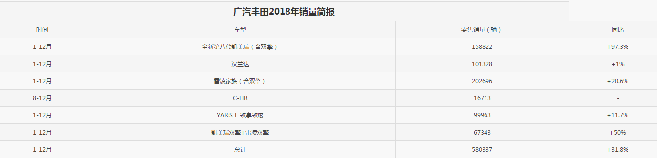數(shù)據(jù)顯示,2018年廣汽豐田突破銷量目標,累計達580337輛,同比增長32%。其中,全新第八代凱美瑞全年銷量近16萬輛;雷凌家族全年銷量首次突破20萬輛;全新漢蘭達全年銷量再次突破10萬輛。