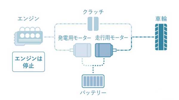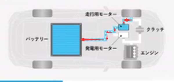 在需要強力加速或電池剩余量較少的情況下,發(fā)動機則會啟動。啟動后帶動發(fā)電機發(fā)電,將電能傳送給驅(qū)動電機。雖然該狀態(tài)下發(fā)動機確實已經(jīng)啟動,但其并沒有直接或者間接的與驅(qū)動軸相連,他的作用僅僅是發(fā)電,此時的車輛更像是一臺增程式混動車。