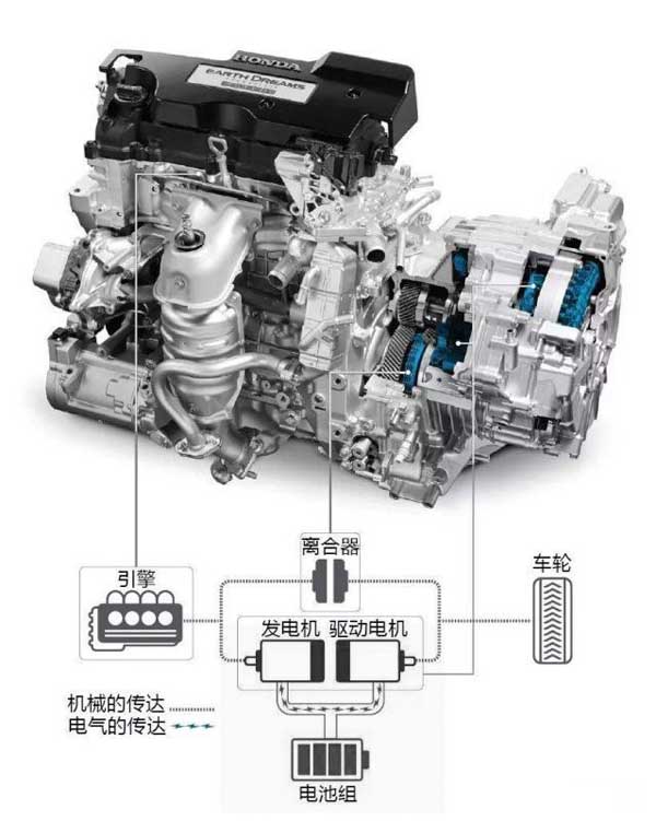混動模式發(fā)動機除了充當增程器之外,需要更強動力時發(fā)動機會與傳動軸直接相連,同時動力電池供電給驅(qū)動電機,實現(xiàn)電動機與發(fā)動機二者動力之和驅(qū)動車輪的混合驅(qū)動模式。同時這一驅(qū)動方式在雅閣混動上沒有出現(xiàn)的驅(qū)動形式。